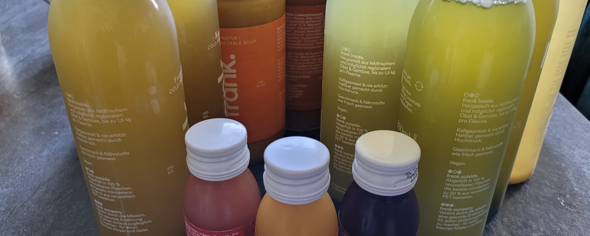 Ich greife gerne auf fertige Saftkuren zurück, bei denen die Säfte portionsweise zur Verfügung stehen und Obst, vor allem aber viel Gemüse enthalten. Werbung für einzelne Hersteller möchte ich hier nicht machen, auch wenn ich meinen Favoriten gefunden habe. Mir stehen pro Tag sechs Säfte mit jeweils 330ml zur Verfügung. Die Besonderheit ist, dass einer dieser Säfte als „Suppe“ bezeichnet und warm gegessen wird. Im Grunde ist es eher gut gewürzter Möhren- oder Tomatensaft, aber da ich beim Fasten meistens friere, finde ich etwas Warmes am Abend großartig. Ganz billig ist der Spaß nicht, aber für die Gesundheit kann man ruhig mal ein bisschen Geld ausgeben, finde ich. Das sind die Produkte, die mir pro Tag zur Verfügung stehen: