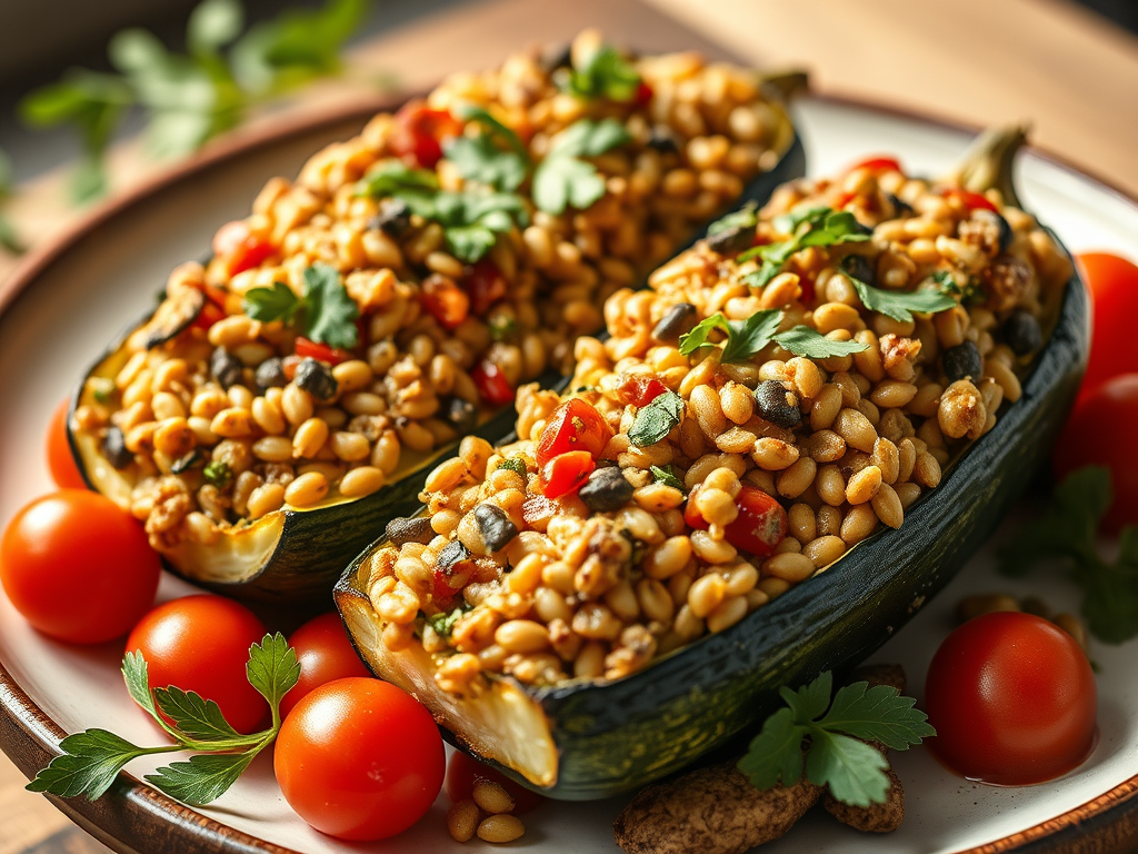 - Das Zucchinifruchtfleisch, Zwiebel und Tomatenmark mit etwas Wasser in der Pfanne andünsten. Die Masse aus der Pfanne nehmen und in einer Schüssel mit Hirse, Frischkäse, Ei und Kräutern, Salz und Pfeffer vermengen und die Zucchinihälften damit füllen.